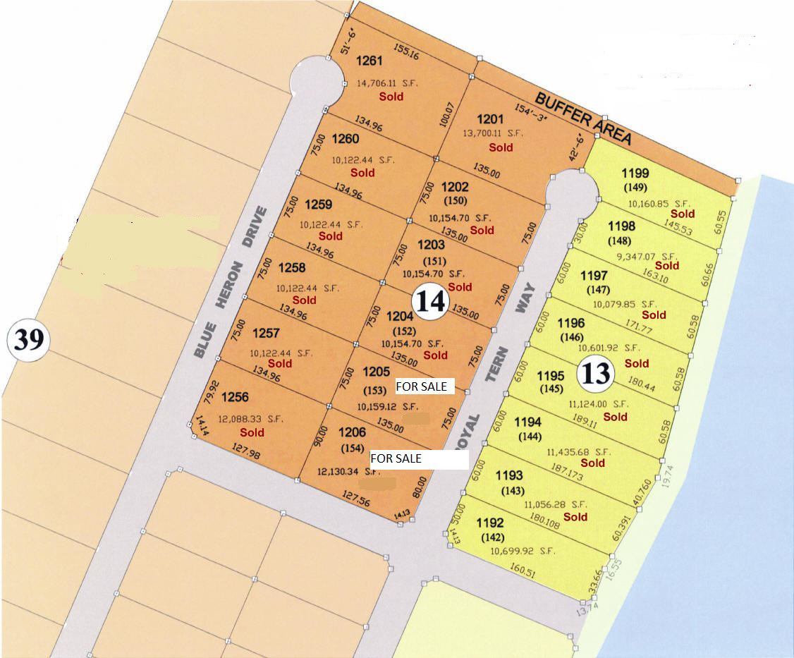 | 1206 | 0.25 | $18,900 | Corner lot, 2nd row from waterfront, 90 ft wide, 135 ft deep, power at lot front |